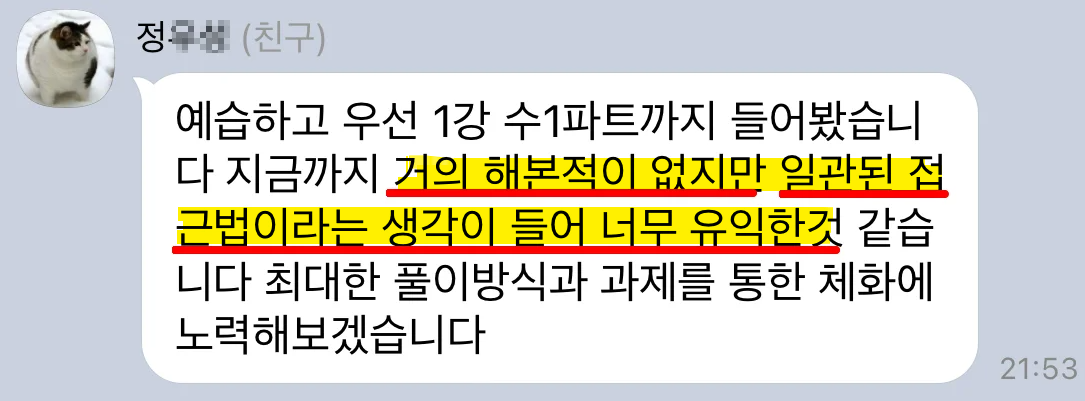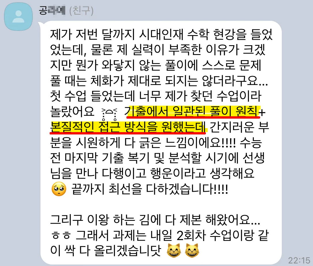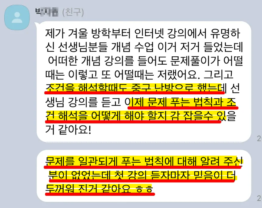 수학 전반에 대한 사고방식을 아예 바꿔준 수업이었어요!! 개념부터 기출을 바라보는 방식까지, 고3 전에는 뭔가 다 암기로 해야할 것만 같고 해도해도 어딘가 찝찝한 느낌이었는데ㅎㅎ 올 한 해 수업 들으면서 ‘아 수학은 확실히 이렇게 해야겠다!’하는 확신이…. 자세히 보기
